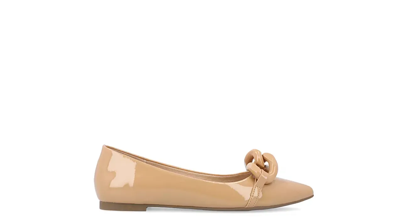 Create a standout look with the Clareene women’s flat from Journee Collection. With a faux patent leather upper featuring an oversized faux chain detail for an edgy appeal, this ballet-inspired flat, with its chic pointy toe, is perfect for any occasion. The padded footbed cushions your feet, while the barely-there block heel offers a subtle lift.