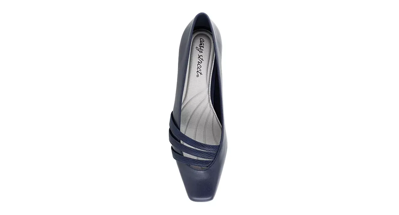 Elevate your professional style with the Easy Street Entice dress pump. Featuring a faux leather upper with asymmetrical straps for a sleek look, this slip-on shoe also has a square toe to reinforce the polished finish. The padded insole cushions your foot while the short heel brings subtle height to your silhouette.