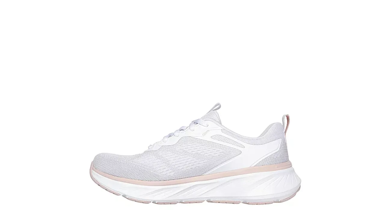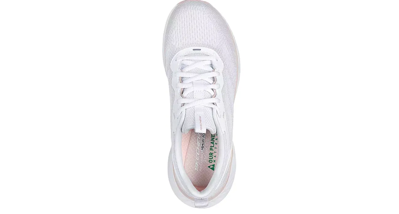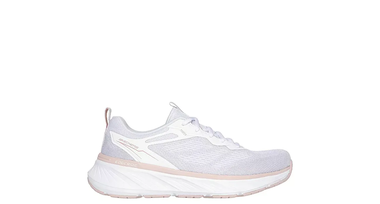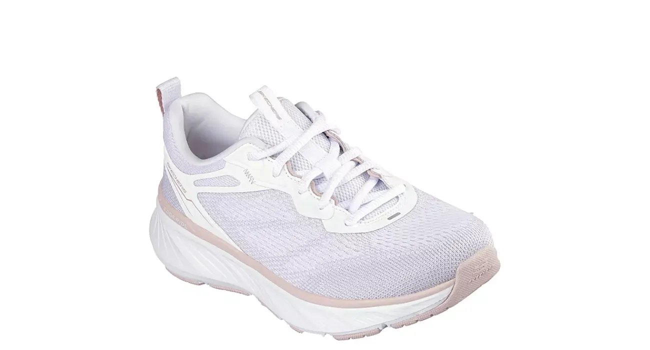 Mind your footprint in the Skechers Relaxed Fit®: Edgeride – Enzoh women’s running shoe. With a knit & synthetic upper that’s machine washable featuring 20% recycled materials, these vegan shoes have a Relaxed Fit® for a roomy toe and forefoot. So comfy with a Skechers Air-Cooled Memory Foam® insole and well-cushioned midsole, while the outsole offers flexible traction.