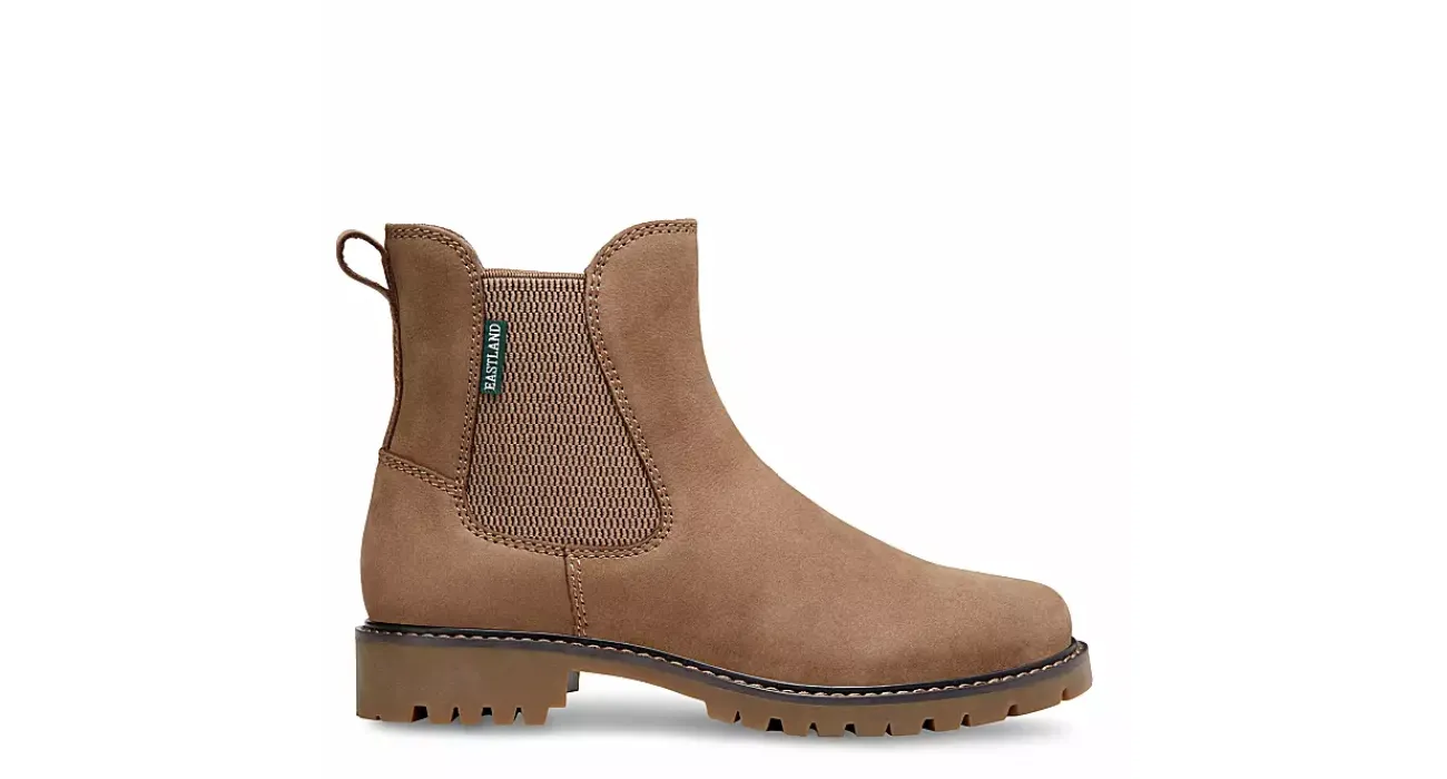 Stylishly trudge through the cold in the Eastland Ida women’s Chelsea boot. With a nubuck upper and dual elastic gores for a secure fit, this pull-on Chelsea boot also features a fabric lining and rear pull tab for easy entry. The Memory Foam footbed cushions your foot while the rubber lug sole stabilizes your steps.