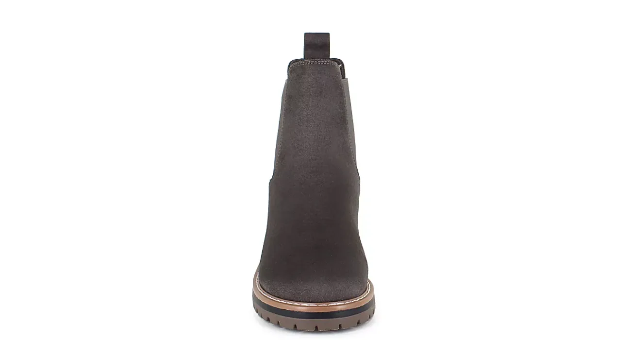 Fall in love with the chic Khai women’s Chelsea boot from Kensie. Featuring a faux suede upper with stretchy gore inserts for a secure fit, this pull-on boot also has a contrasting, stitched trim. The insole soothes your foot while the 1 1/2″ block heel with its lug traction keep you grounded in style.