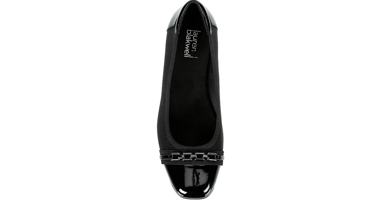 Work it out in the Lauren Blakwell Kinsly pump. Featuring a textile & patent leather upper with a patent leather cap toe and thin chain link detail, this pump does more than just casual. The lightly cushioned footbed soothes your foot as the 1 1/2” wedge heel adds just enough lift.