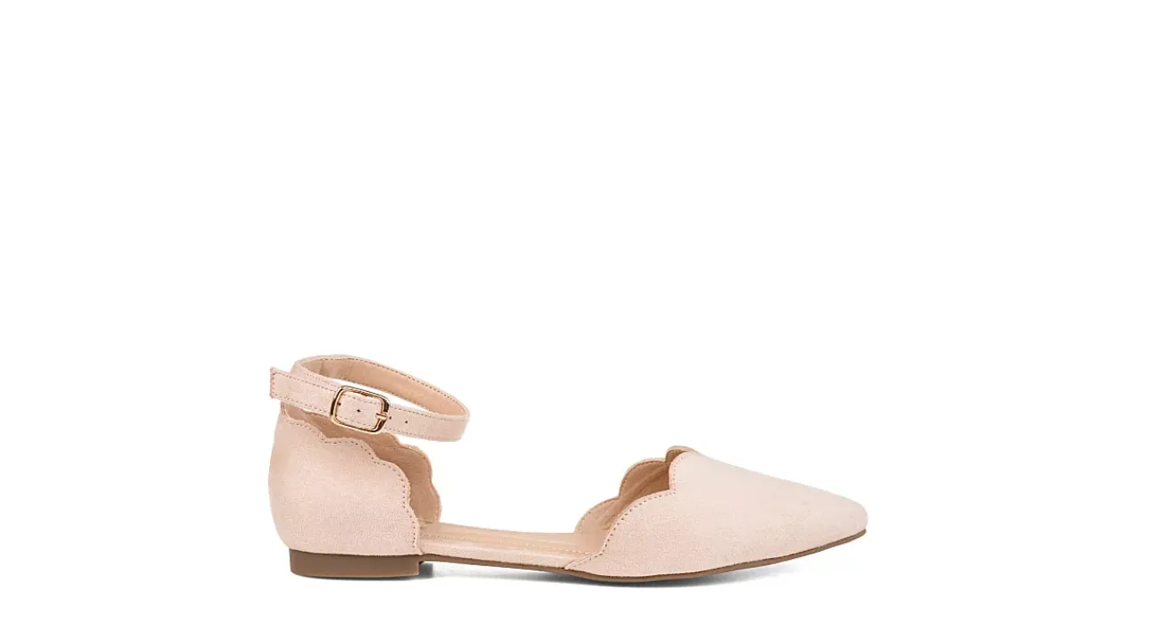 Vintage elegance gets updated in the Lana women’s flat from the Journee Collection. With a microsuede upper and d’Orsay design for extra style, these buckle ankle strap flats also have a pointed toe and scalloped trim for a feminine touch. The padded footbed cushions your steps while the 1/2″ block offers subtle lift.