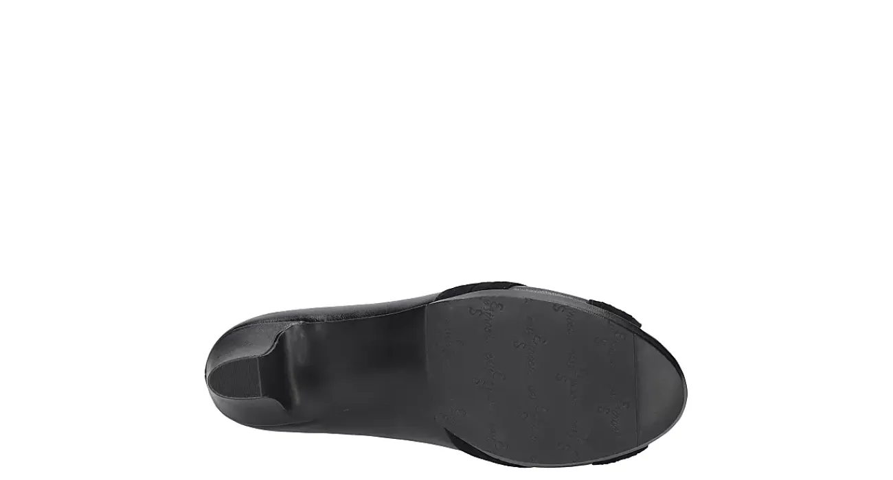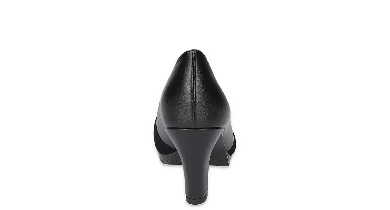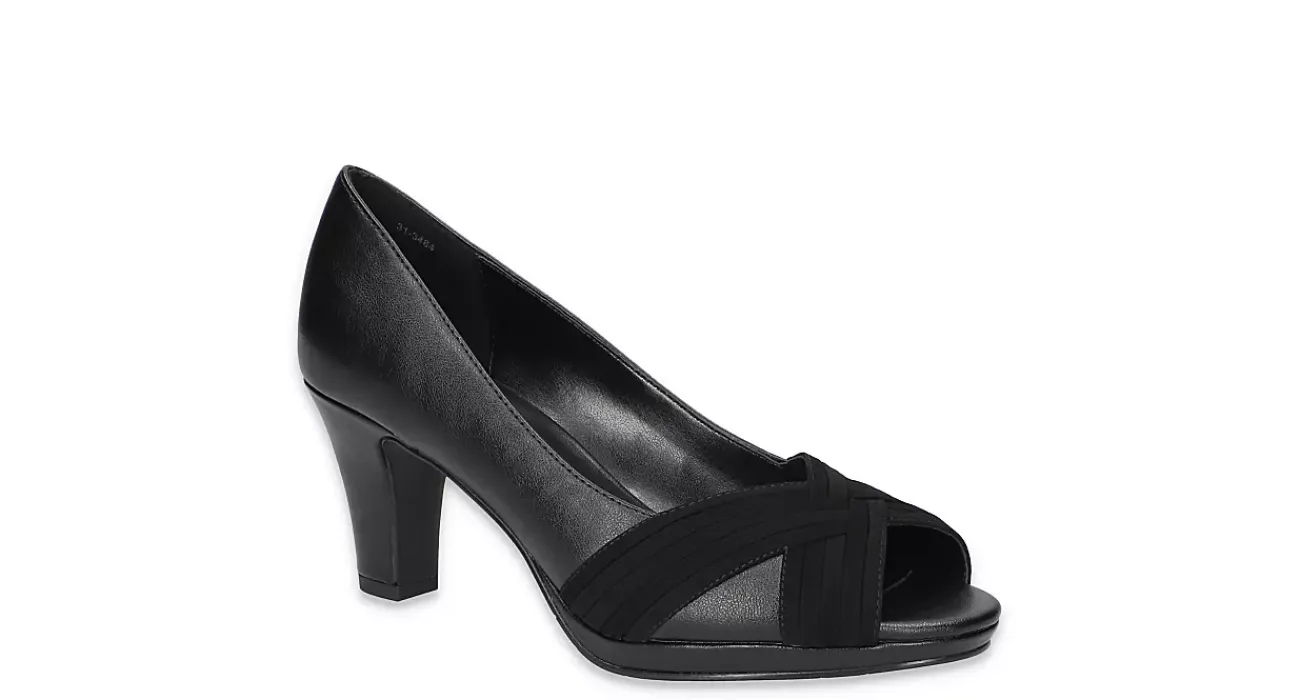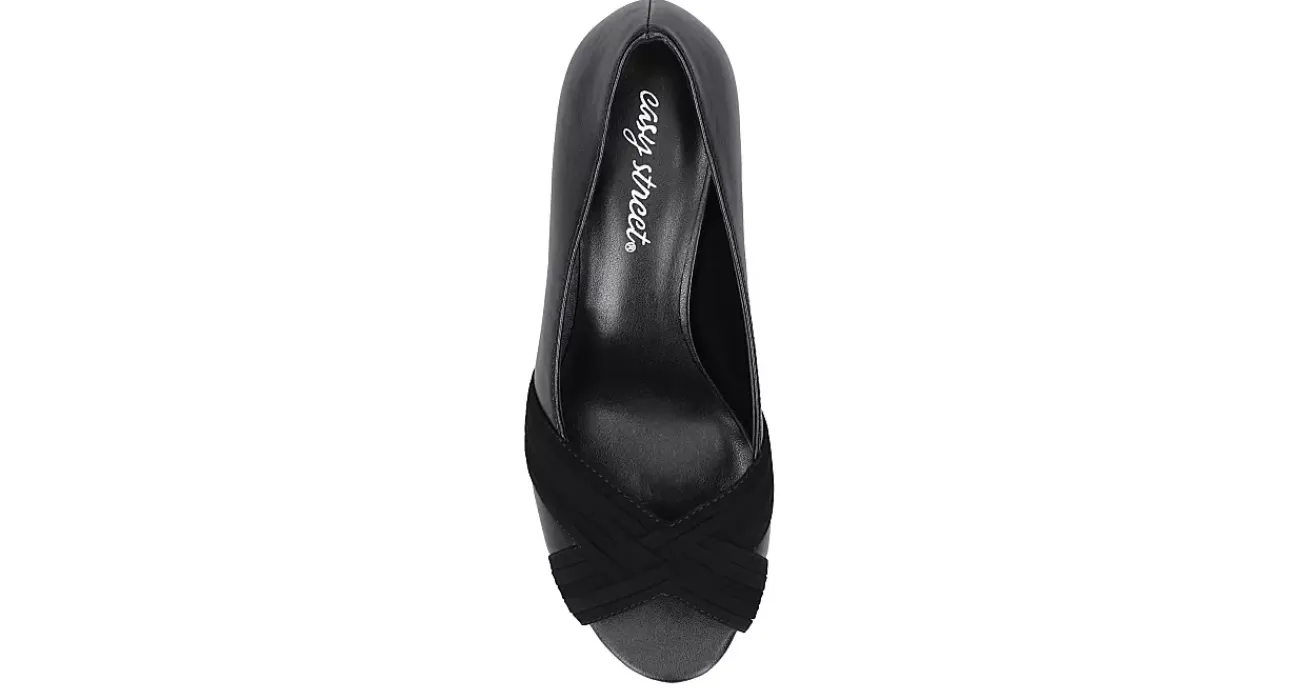 Dress elegantly on-trend in the Lavish pump from Easy Street. With a faux leather upper featuring a multi-material strip overlay, this peep-toed shoe is perfect for a special evening. The insole cushions, while the block heel offer just enough stable lift.