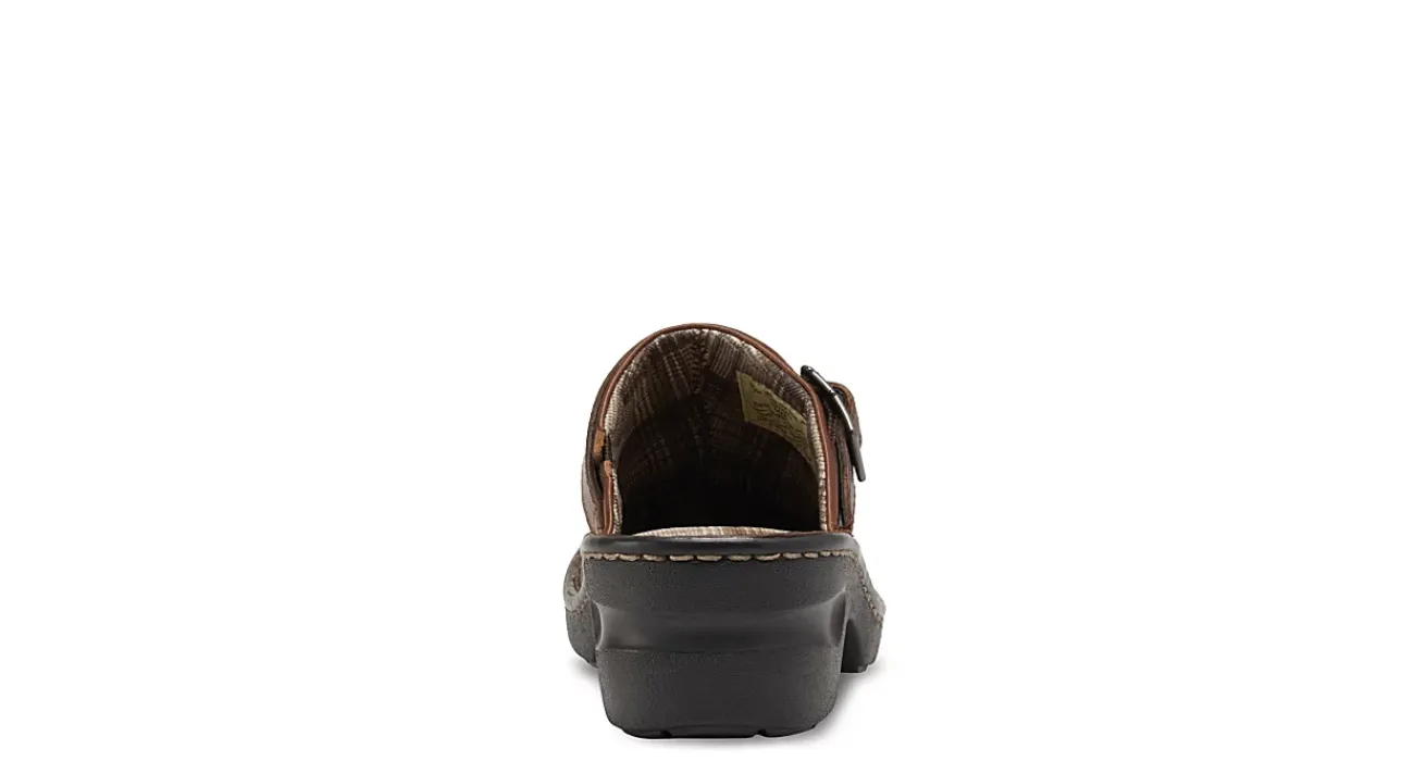 Add a clog loaded with style versatility to your wardrobe with this Eastland Mae. The leather or nubuck upper has a closed toe clog design with contrast stitching and an overlay adjustable buckle for a clean look. The 2″ heel lifts your silhouette to make this the perfect clog for any outfit in your closet.