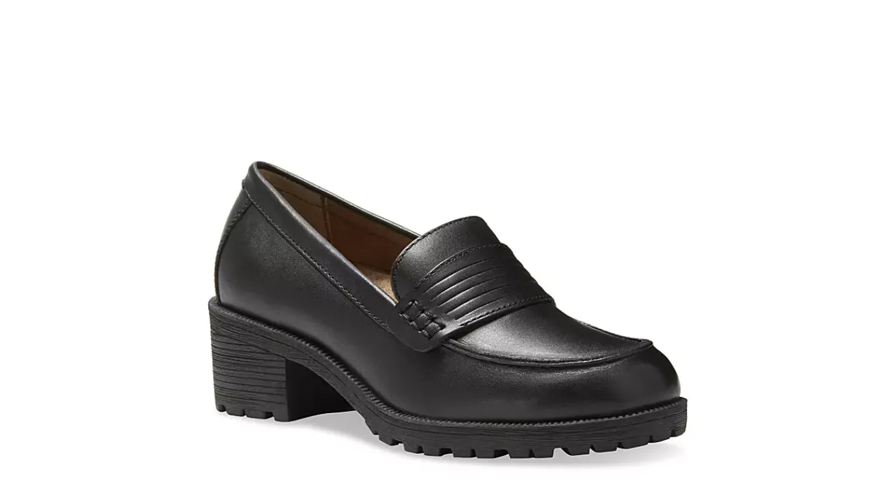Polished, proper and so posh describe the Newbury women’s loafer from Eastland. With a leather upper and decorative penny keeper detail for flair, this slip-on loafer has classic style for fall. The OrthoLite cushioned insole comforts your foot while the chunky heel adds some lift.