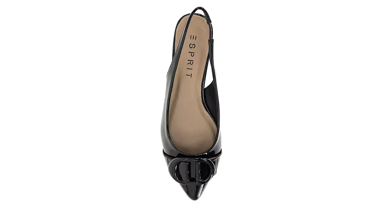 Outshine the field in the Preslee Slingback women’s flat from Esprit. Featuring a patent leather upper with a large ornament for extra style, this pointed toed flat has bold good looks for versatility. The insole cushions your foot, while the outsole adds durability.