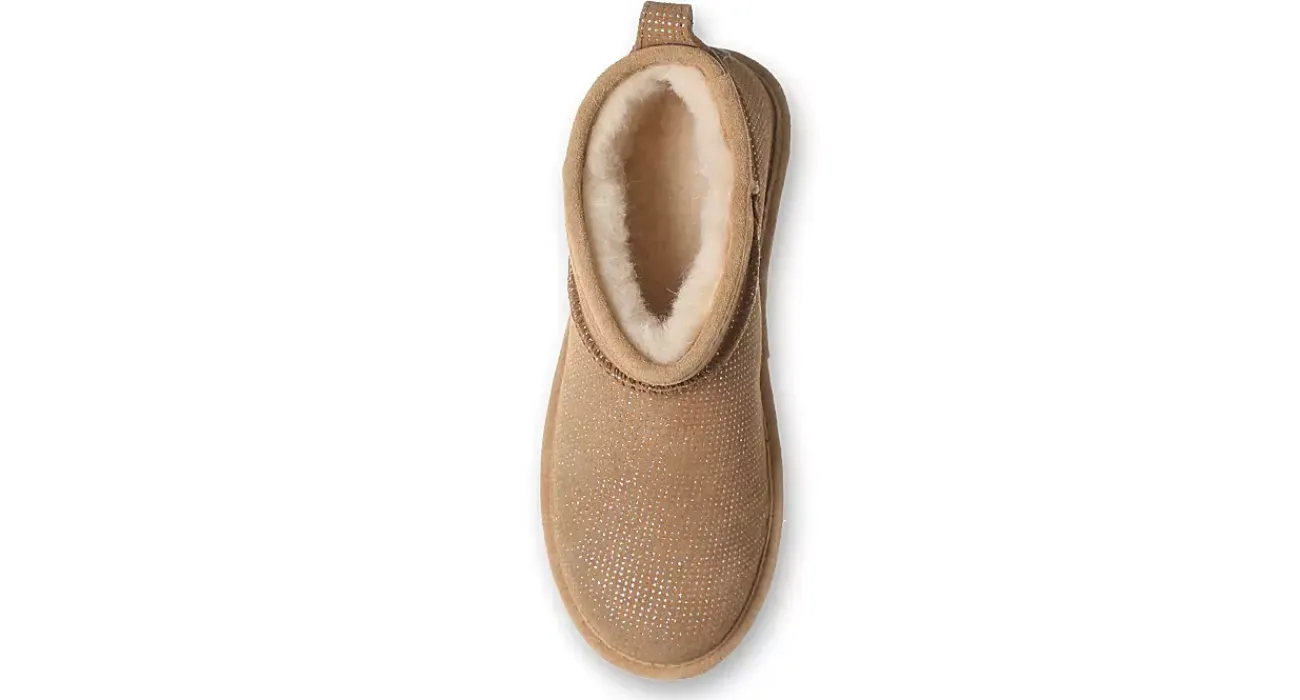 Glitter up to your ankles in the Shorty Exotic fur boot by Bearpaw. With a glitter-accented suede upper treated with BearCoat™ Rain and Stain Repellent to protect against the elements, this pull-on bootie is perfect for cold days out and about. The lining & footbed offer warm cushioning while the outsole adds some traction to your unbothered steps.
