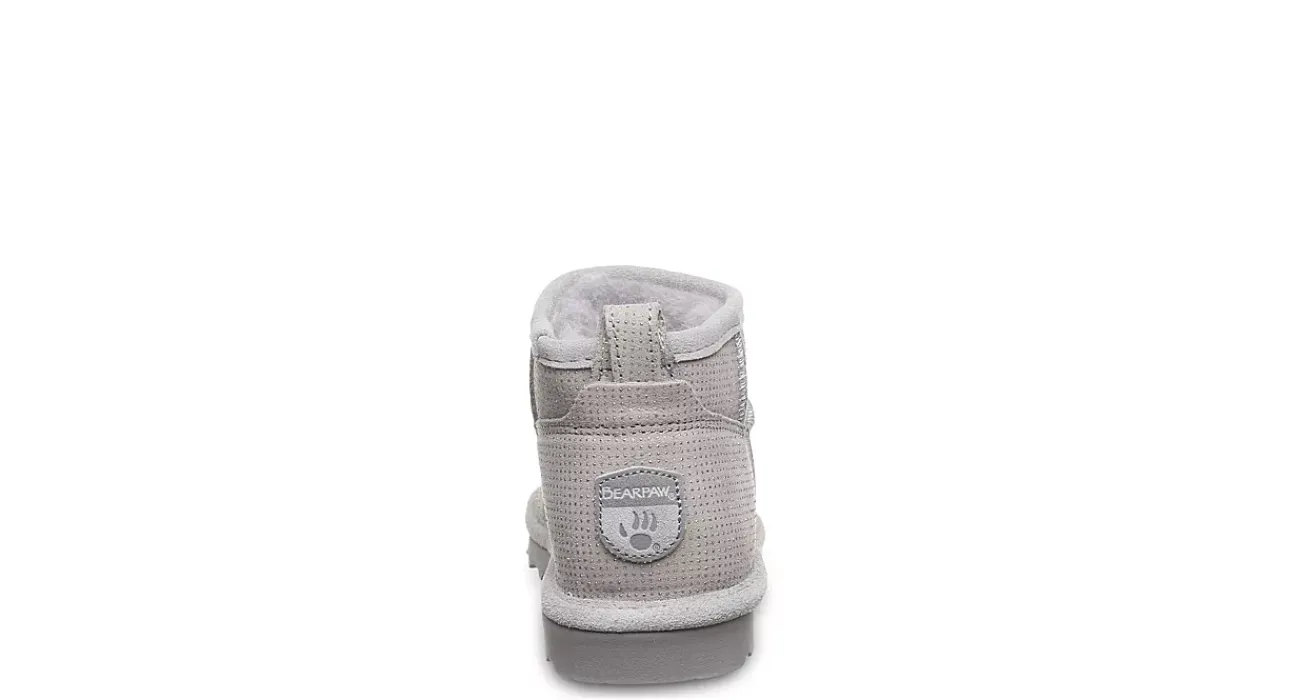 Glitter up to your ankles in the Shorty Exotic fur boot by Bearpaw. With a glitter-accented suede upper treated with BearCoat™ Rain and Stain Repellent to protect against the elements, this pull-on bootie is perfect for cold days out and about. The lining & footbed offer warm cushioning while the outsole adds some traction to your unbothered steps.