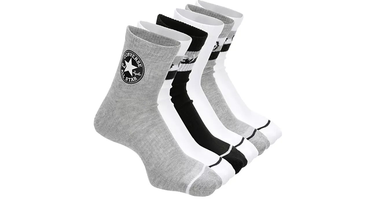 Break out your favorite pair of Chucks and don’t forget the Converse Stripe Logo Quarter socks 6 pack. With a soft knit feel featuring ribbing for a secure fit, these socks showcase the Converse Chuck Taylor All-Star patch and the Star & Chevron logo with stripes. The targeted cushioning makes walking comfy.