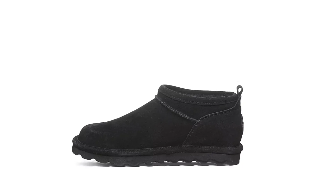 Keep that warm profile lower in the Super Shorty Wide fur boot by Bearpaw. With a suede upper treated with BearCoat™ Rain and Stain Repellent to protect against the elements, this pull-on bootie is still perfect for cold days out and about. The lining & footbed offer warm cushioning while the outsole adds some traction to your unbothered steps.