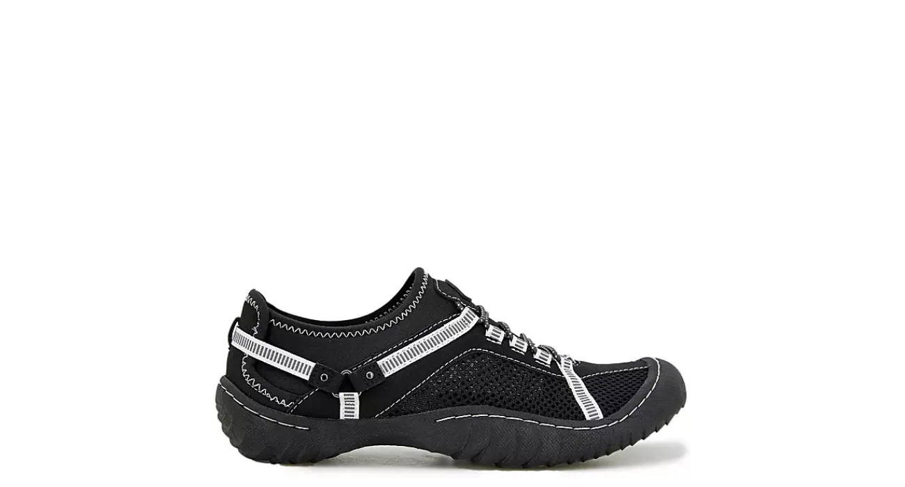 Forge ahead, in orderly fashion, with the JBU Tahoe Wide women’s water shoe. With a water-ready mesh & microfiber upper featuring bungee cord lacing for a secure fit, this slip-on shoe also has color-blocked canvas harness accents for a pop of style and extra support. The contoured EVA insole cushions every step while the non-slip outsole offers durable, multi-surface traction.