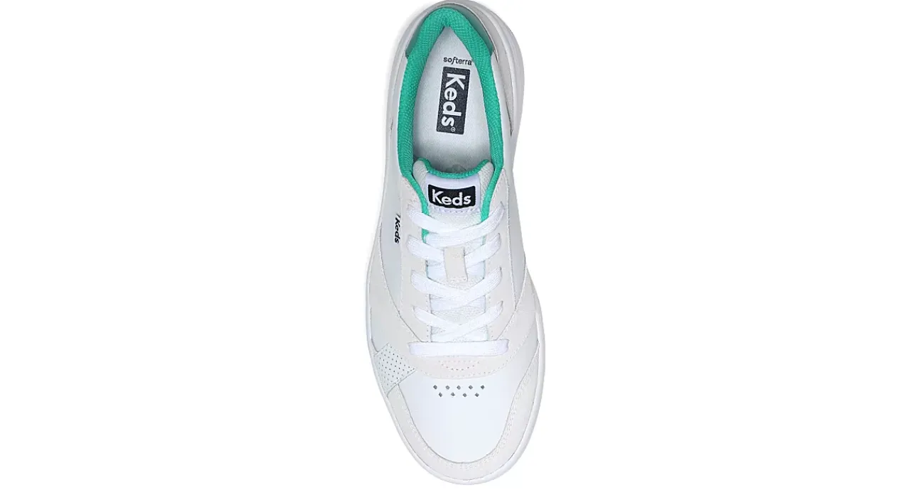 Sport your edge in The Court Leather women’s sneaker from Keds. Featuring a leather upper with a breathable mesh lining and padded collar & tongue, this old-school style has modern comfort inspired by Ked’s tennis heritage. The recycled foam Softerra™ footbed cushions, while the lightweight outsole adds bounce.