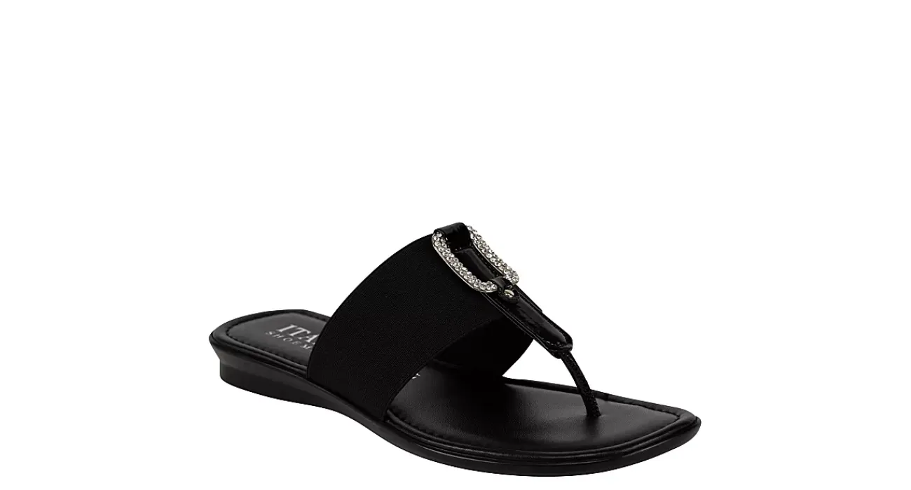 Sparkle this summer in the Triana flip flop sandal from Italian Shoemakers. With a faux leather upper adorned by a rhinestone ornament, this slip-on adds elegance to any outfit. The footbed comforts your foot, while the slight wedge keeps you grounded.