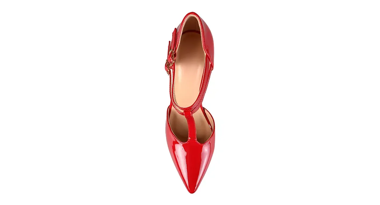 Polish up your style in the Tru women’s pump from the Journee Collection. With a glossy vegan leather upper featuring a sleek pointed toe, these dual buckle T-strap stilettos are ready for a grand entrance at your next event. The padded footbed comforts your foot while you strut on that 4″ stiletto heel and take all the names.