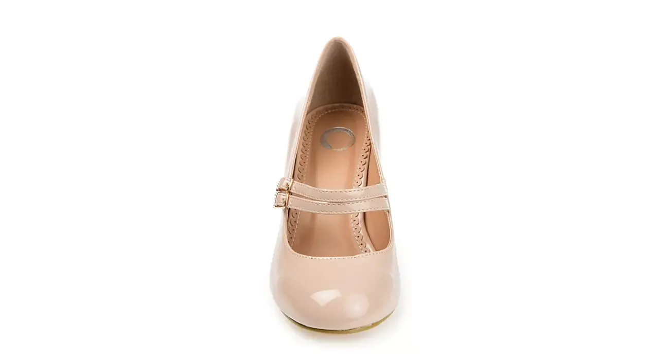 Show off your elegant style with the Wendy women’s pump from Journee Collection. Featuring a vegan patent leather upper in a midcentury design, this dual buckle strapped Mary Jane has a dainty appeal. The footbed cushions your steps while that high heel is sturdy.