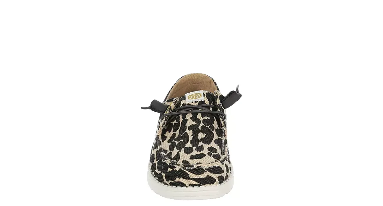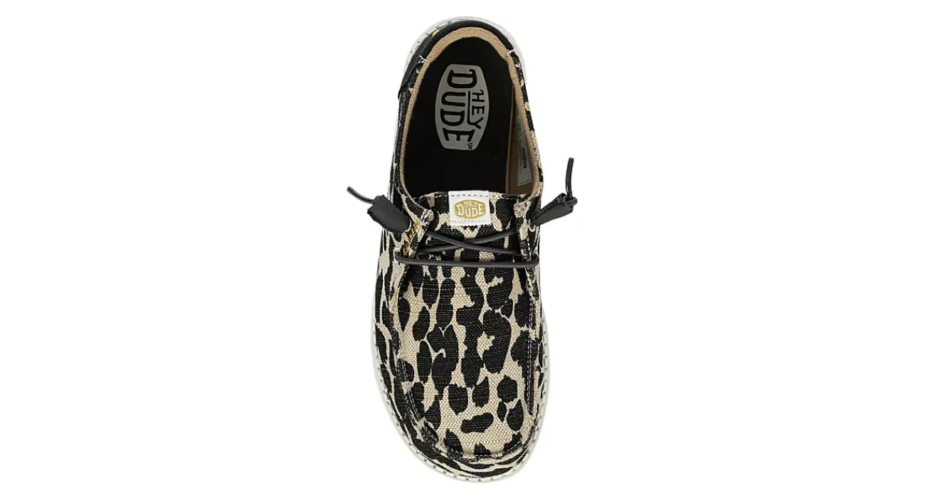 Catch some attention, for all the right reasons, in the HEYDUDE Wendy Leopard Sparkle slip-on sneaker. Featuring a leopard shimmer canvas upper with a shiny metallic finish, this slip-on is treated for extra protection. The removable insole cushions, while the ultralight outsole sets you free to explore unfettered.