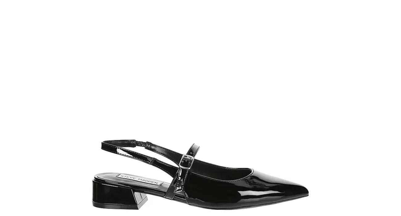 Start low and shine bright in the Yazmin Slingback flat from Steve Madden. Featuring a glossy patent leather upper with a Mary Jane strap across the instep, this slingback is a little more than a typical flat. Comfort follows from the footbed to the low heel.